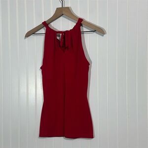 Iconic Cache red halter-style sleeveless top in size XS — perfect for a glam night out or that nostalgic Y2K party look. Features pleated front detail and a rhinestone-embellished neckline with an adjustable tie at the back. Slight stretch for a flattering body-skimming fit.