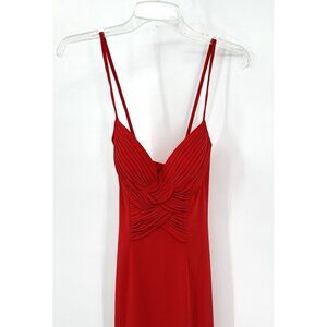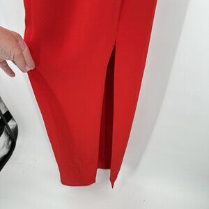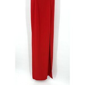 Elegant red maxi dress. Features a stylish front design. Perfect for evening wear.