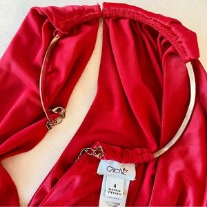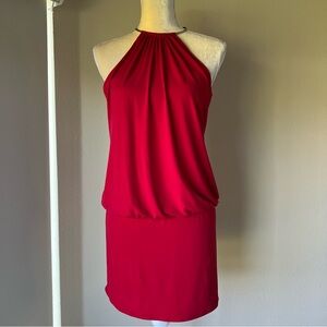 Chic red mini dress by Cache. Features a stylish halter neckline with golden detail.