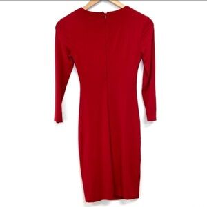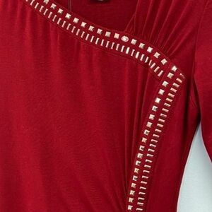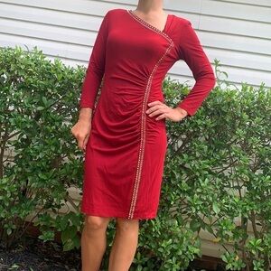 Cache | Red Ruched Deep Dress bling rhinestone fitted holidays Christmas M midi
