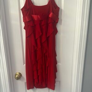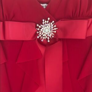 Chic red mini dress with ruffle details. Features a decorative brooch and spaghetti straps. Perfect for a night out.