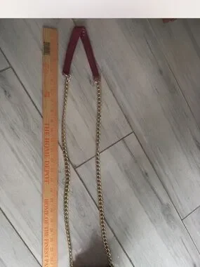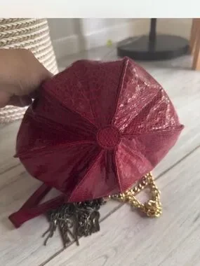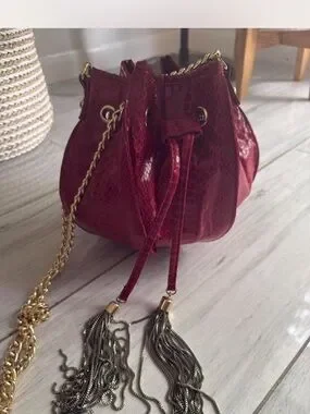 Compact drawstring bucket bag in rich red. Textured finish with decorative tassel chains. Gold chain strap for shoulder or crossbody wear. Stylish and eye-catching for outings.