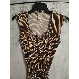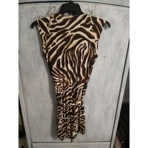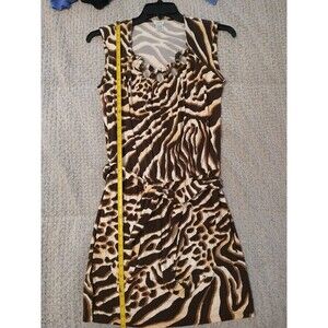This Cache Retro Edgy Zebra Print Dress in Brown and Cream is perfect for any occasion. The dress is made of Rayon fabric and has a sleeveless design with a round neckline. It has a pullover closure and is an A-line style dress with a short length. The dress is ideal for travel, weddings, holy communion, parties, casual wear, workwear, and business settings. The dress is available in size M and is suitable for women. The dress is not vintage and is not personalized. It is a regular size type and is perfect for any season - winter, summer, fall, and spring. The dress is not handmade and is from the Cache Cache brand.