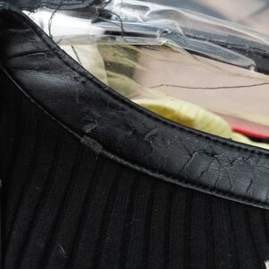 Very cool sweater. Lace up detail with faux leather trim. I was just packing an item, and this sweayer was in the same sealed bag. Turns out there is some damage to the back inside trim. See photos. Other than that, it's in very good condition.