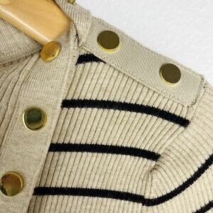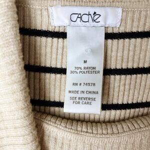 Cache Ribbed Stretch Cowl Neck Sweater in Size Medium. Fold over neck with gold accent snaps. Lots of stretch. Color is a gold-beige with black stripes. No stains or rips. Approx measurements without stretching: 13” pit to pit. 27” length. 17.5” pit to cuff.