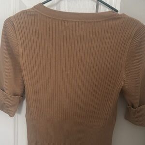 Cache ribbed top with lace-up neckline. Features elbow-length sleeves. Stylish and versatile.