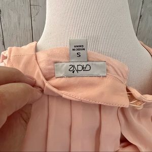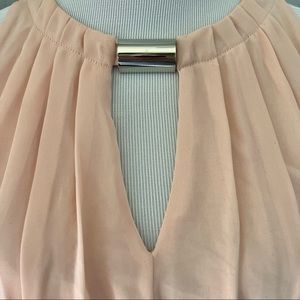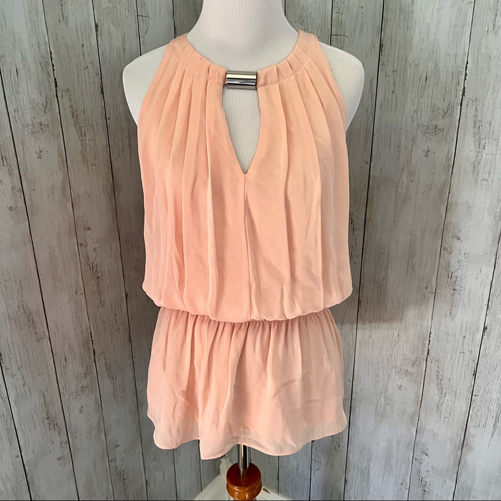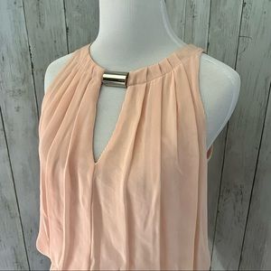 Cache | Ruched Blouse with front metal detail and back button closure.