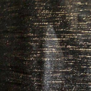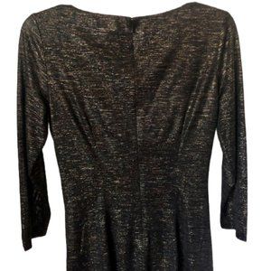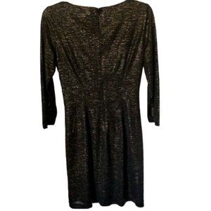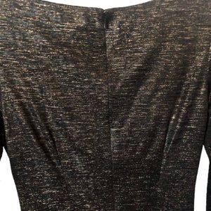 Striking boat neck sheath in a translucent black and gold polyester fabric, fully lined except the 3/4 length sleeves