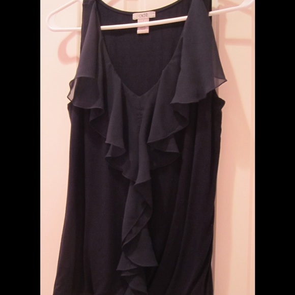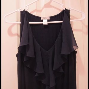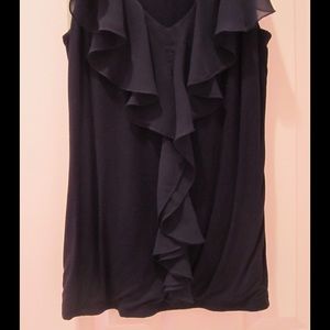 Pre-owned sleeveless knit pullover in navy blue in a size small. Shell is made of 95% rayon & 5% spandex. Ruffle is made of 100% polyester. Hand wash cold, inside out, lay flat to dry, cool iron as needed. Worn several times, it's in very good condition. A really comfortable shell, great for layering all year.