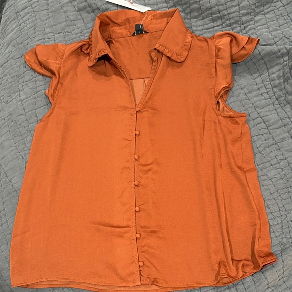 Chic rust blouse with ruffled sleeves. Features a button-down front. Ideal for any occasion.