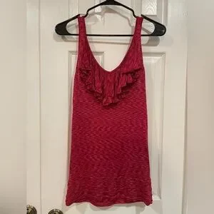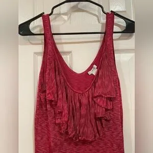 Chic reddish pink tank with ruffle detail. Perfect for casual wear. Soft and flattering.