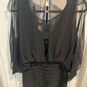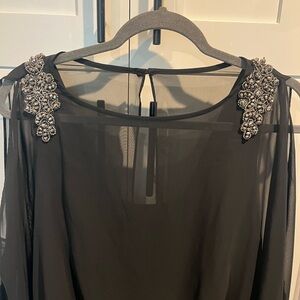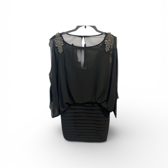 Stylish Cache dress in black. This is a signature piece for your collection. Vintage, excellent condition, wore once, Features sparkling embellishments on the shoulders. Wing style arms. Ideal for elegant events. No zipper, pull on pull off, stretchy, comfortable.
