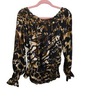 Cache Silk Animal Print Beaded Smocked Detail Balloon Sleeve Beaded Tie Size M