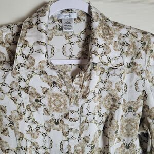 Cache Silk Button Down Shirt Women's Size Medium White Tan Old Money Equestrian