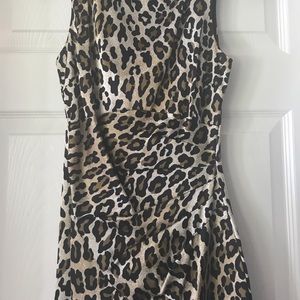 Cache Leopard Print Silk dress, fitted to knee. Gathered at side, worn once