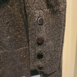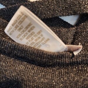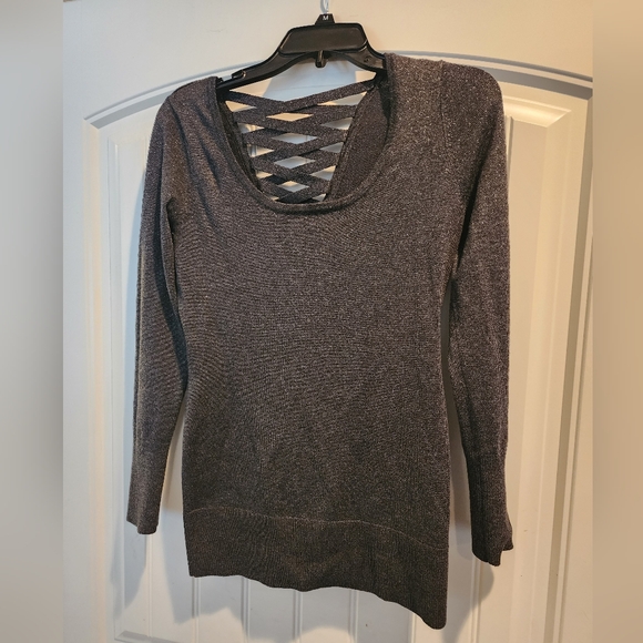 This silver sweater is in great condition. It was worn only a few times. It is a little stretchy but true to the size small.