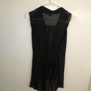 Good condition, missing top button. Cache. Sleeveless button down blouse. Sheer. Black. Studded cut outs at shoulder. Pleated in back with tie closure. Pit to pit laying flat 18” Shoulder to hem (front/back) 26”/32”. All measurements are approximate and taken lying flat. Smoke free home. No trades, offers welcome.