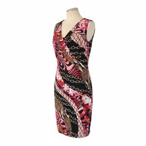 Keywords: Cache dress size L, cocktail party dress, cowl neck bodycon, pink black print dress, women’s going out dress, Cache sheath, vintage Cache style