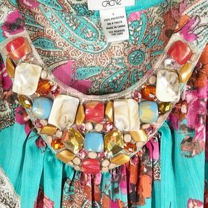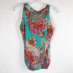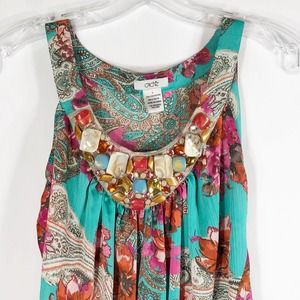 Cache Small Top Green Red Beaded Stones Banded Cami Tank Sleeveless Chiffon 557