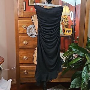 Cache Black strapless Midi Cocktail dress, beaded front, ruffled assymetrical hes, invisible back zipper, fully lined, size 4. Excellent pre loved condition, measurements in pics, smoke free home, ships next day. Bundle and Save!