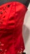 Vibrant red strapless dress with intricate black embellishments. Perfect for special occasions. Bold and elegant design.