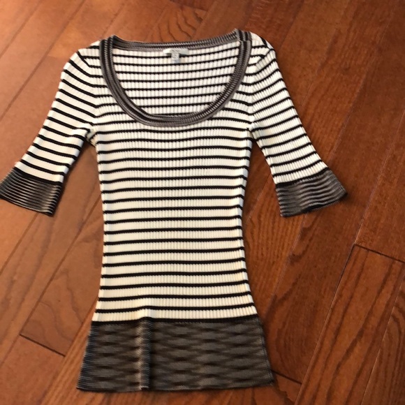 Worn 2-3 times. This top will dress up any outfit! There is al lot of give in the fabric, 79% rayon and 30% spandex. Length, from top collar to the bottom is 25”. Measure from armpit to armpit is 24.5 around.
