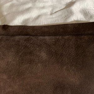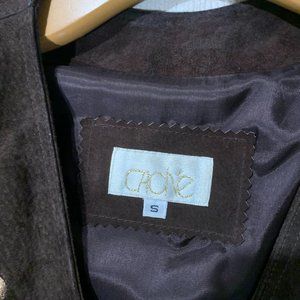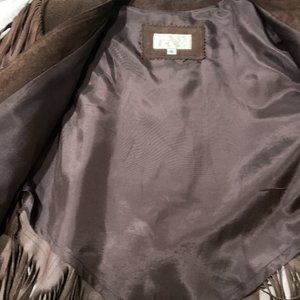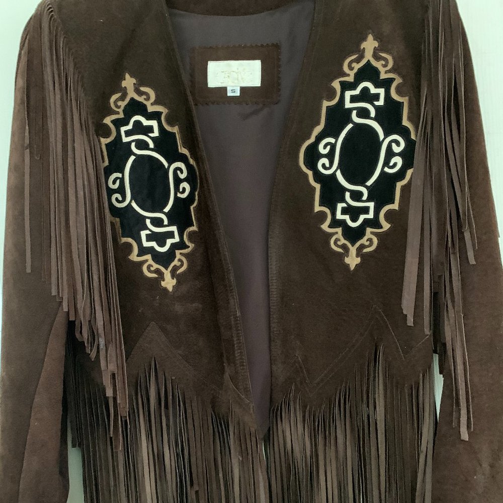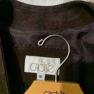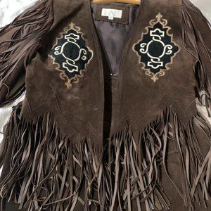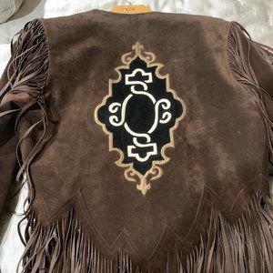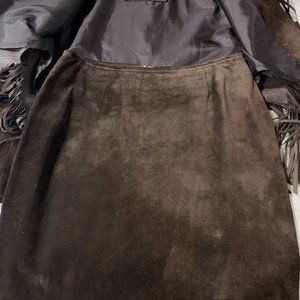 One of a kind Cache Suede Suite, Designer design and fringes on jacket, the hem was let down on the shirt and needs drycleaning has spot on skirt. Wear around the hedges but beautiful. Size is small