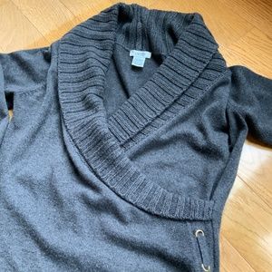 Beautiful and flattering sweater from Cache. Dress up or dress down perfect with leggings, tights or jeans. Gold hardware crisscross neckline.