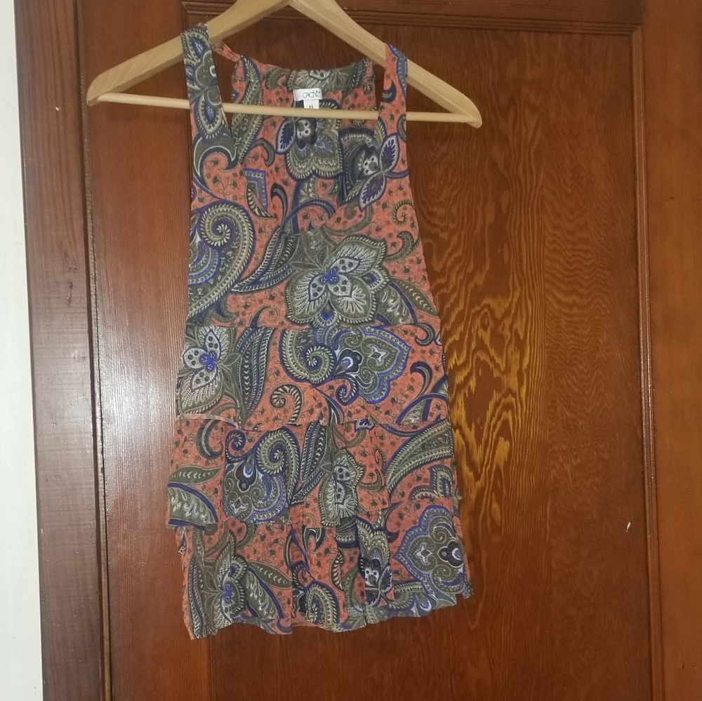 Like new condition, cache brand tank. Size xs. Multiple tiered, ruffled shirt. Paisley print, green, orange, and blue in color. Perfect for day or night.