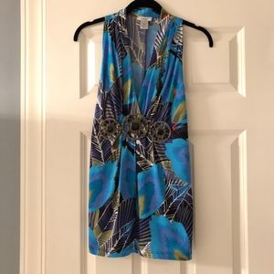 Cache stylish sleeveless top and a tie in the back. Metal embellishment in the front. V Neck. Excellent condition.