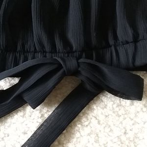 Beautiful sheer chiffon cold shoulder top by Cache. It has covered elastic around the three quarter length sleeves, scoop neck collar, and at the bottom. The bow at the bottom does not work as a drawstring,. The sleeves are open in two places with small covered buttons. Wear with a tank under and look fabulous. This top is just stunning when on.