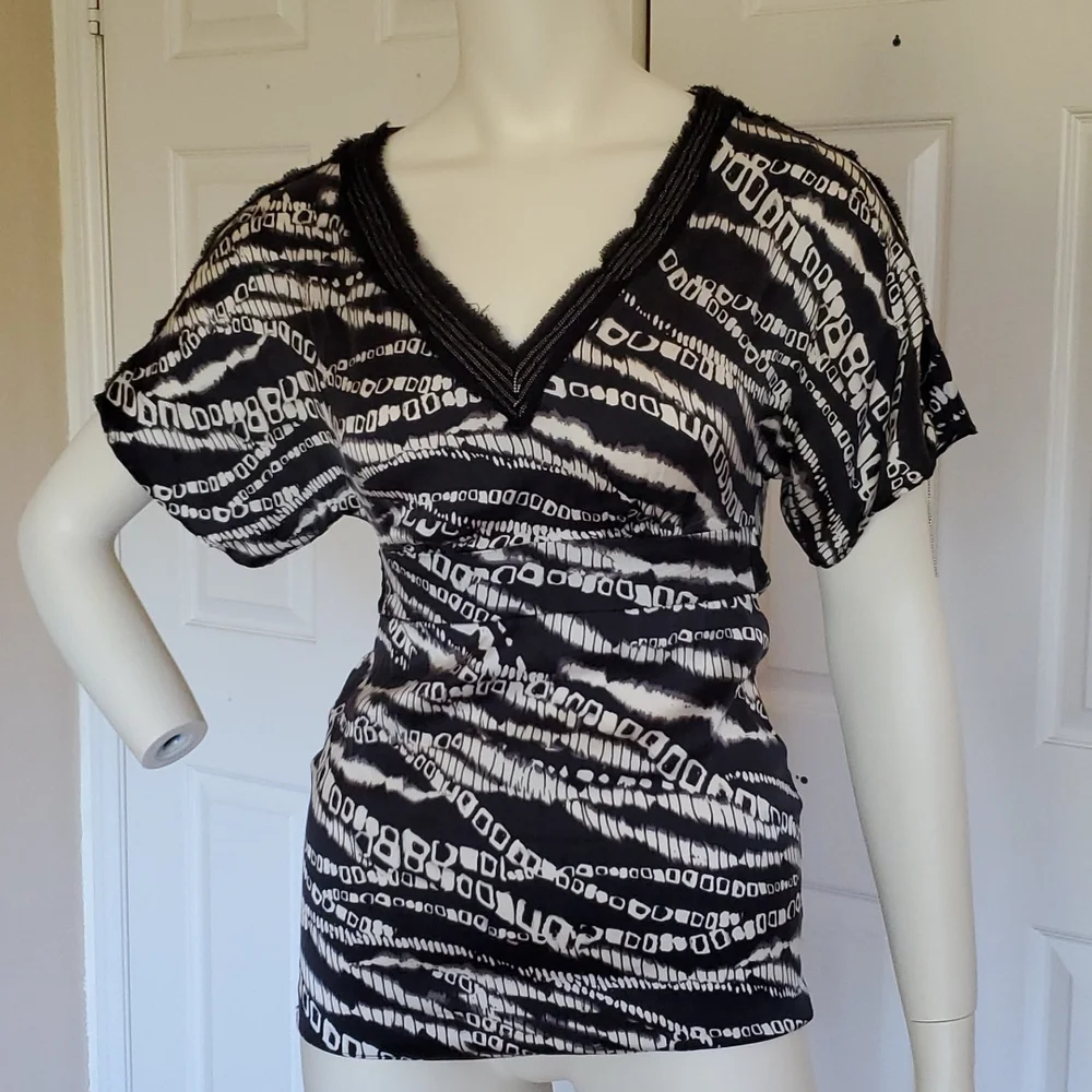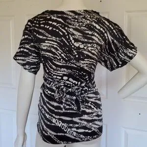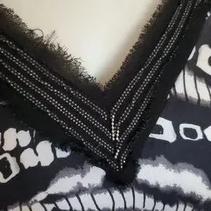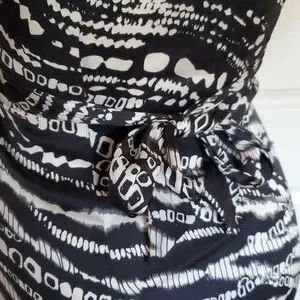 EUC, black and white design. minor unnoticeable signs of wear (loose chain on sleeve, loose thread on waist tie, see pics). no tears or stains as far as I can tell. beautiful feel and fit! all offers welcome, bundle to save on shipping!