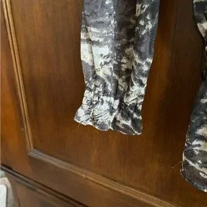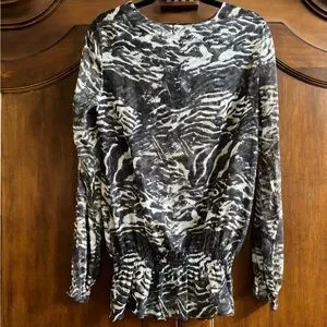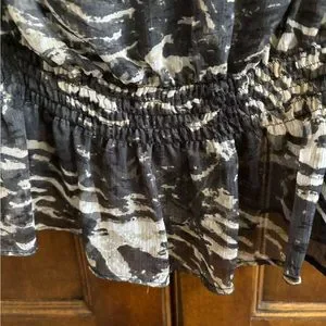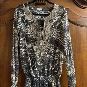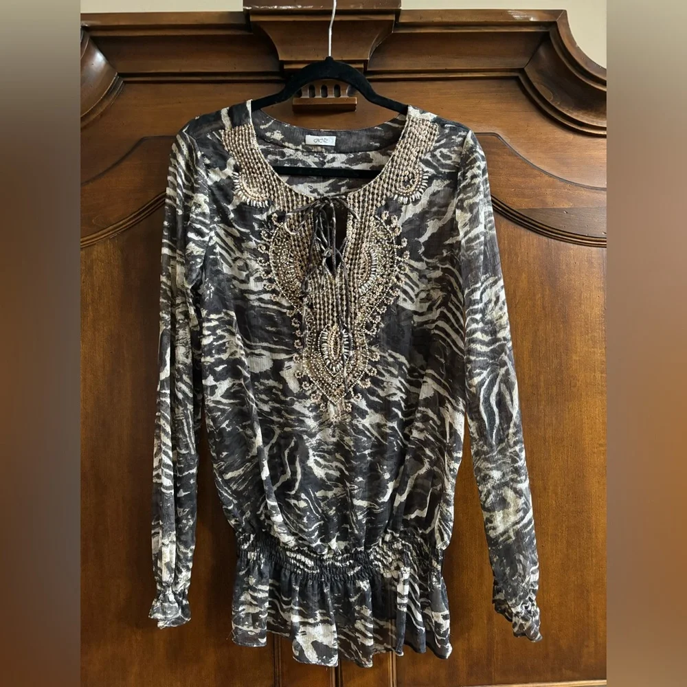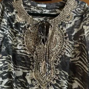 Cache’ Top. Brown/Cream print with beaded trim at double tie neck. Sheer fabric. Elastic at waist and sleeves.