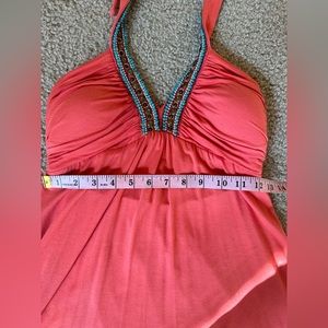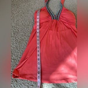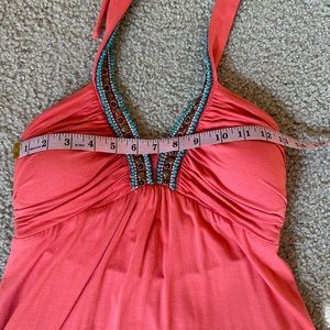 I just love the beads on this top. The low cut makes it sexy as well. It has a rubber band along the top to keep it in place. The color is a coral. Comes from a smoke free home.