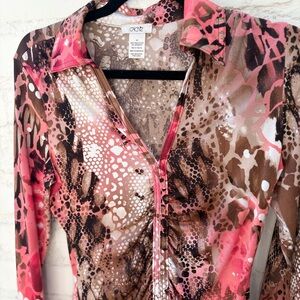 Elevate your wardrobe with the Women's Top, featuring a vibrant pink and brown pattern. Perfect for any occasion, this stylish top combines comfort with a bold design.