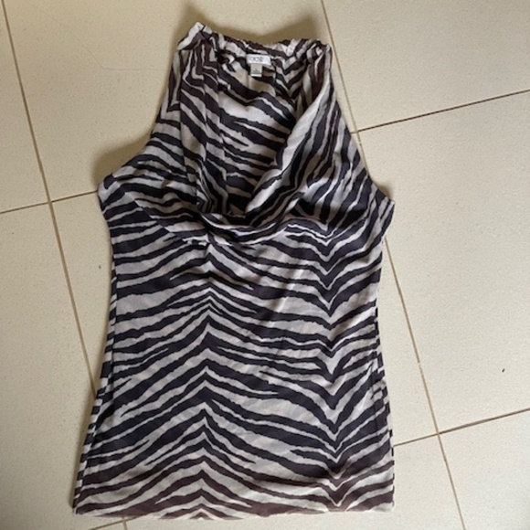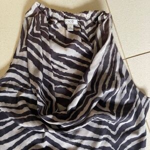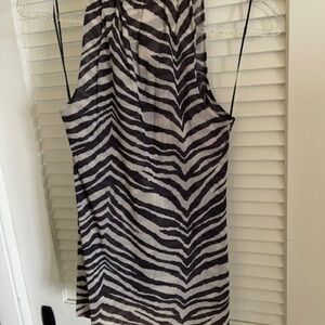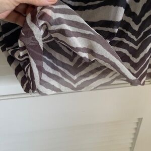 Double netting fabric, has lots of stretch. Cut in shoulders. The fabric has gradations of dark brown to black zebra stripe. It's very slight but it's there.