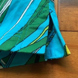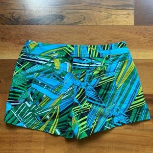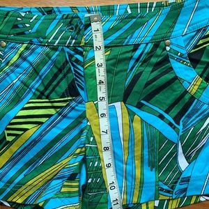 Vibrant tropical print shorts. Features blue and green hues. Perfect for summer outings.