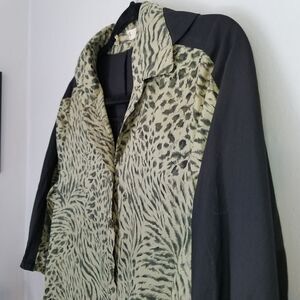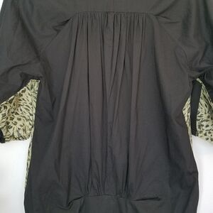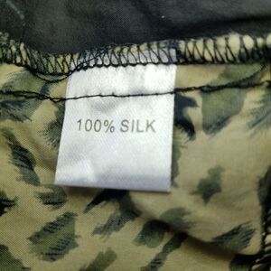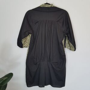 This is a fun lightweight silk top from Cache. This is the perfect blouse to pair over some leggings and sandals for the summer. The design features and mixed animal print with both leopard and zebra striping on a moss green background. Normally a pattern like this may be overwhelming but the designer intelligently paired it with a solid black sleeve, back and shoulder accents. The shirt is a classic tunic length hitting right around mid thigh (depending on your height), with half length sleeves that are elasticized so you don't have to keep pushing them up! It also serves the duel purpose of giving the sleeves a slight puff. The back of the tunic is beautifully tailored with pleating on the top and bottom. The fabric is a lightweight 100% silk. The shirt is in excellent vintage preowned condition. The only imperfection is that the label has been cut. You can still see enough to know that it is from Cache. The size label was also removed but judging by the measurements I believe this is a size small. I think this may have been a sample item for a fashion show. It is priced accordingly.