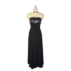 Vintage 1990s Cache Bianca Nero strapless black maxi dress with reptile embossed leather bodice. Fully lined, hidden back zip. Marked size P, see measurements for best modern fit. The ideal dress for prom, homecoming, holiday party, premiere, red carpet, banquet, black tie, gala, fundraiser, event, symphony, graduation, winter formal, ball, or date night. In gently preowned condition, no flaws noted. Shown on size 4 dress form. Measurements are approximate, lying flat.