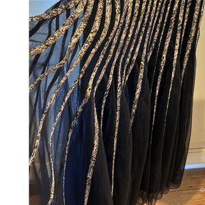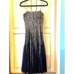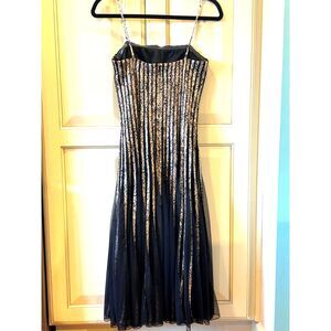 This stunning vintage Cache dress is a guaranteed head-turner! It is so beautiful! The contrast of the gold accents against the pleated black mesh will make a splash at any cocktail party or formal/semi-formal event. Style with gold jewelry and strappy metallic heels for a gorgeous look! Size 2 measures approx 15" pit-to-pit and and 42" long. Excellent vintage condition.