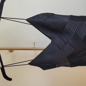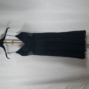 Elegant and timeless Cache dress in black, size 6. Features a flattering V-neckline, spaghetti straps, and a pleated skirt with mesh panel accents for a modern twist. Perfect for cocktail parties, formal events, or evening wear. Gently used with no major flaws.