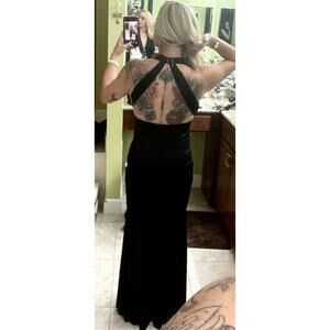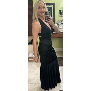 Cache Vintage Medium mermaid Black rhinestone pendent halter clasp open back Maxi