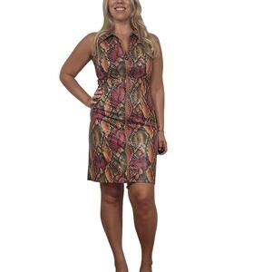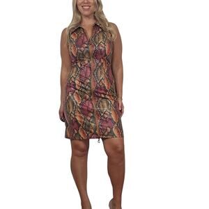 You'll look stunning in this vintage Cache bodycon dress! The unique snake print is sure to turn heads, and the zipper down the front adds a touch of edginess. This dress is in excellent condition and is a size small. Don't miss out on this one-of-a-kind piece!
