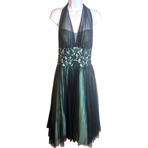 Cache Vintage Teal Black Y2k Chiffon Overlay Halter Fit & Flare Party Dress sz 6