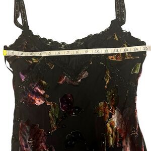 Step into moody romance with this WhimsyGoth Caché burnout velvet slip dress — black base with jewel-tone florals, glass bead embellishment, and lace trim at the neckline. 70% rayon / 30% silk blend, with full lining.