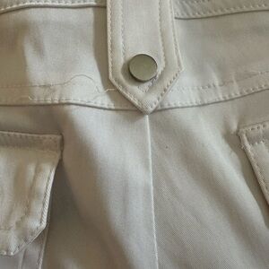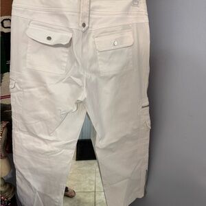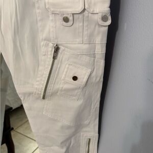 Stylish white cargo pants featuring multiple pockets and zipper details. Perfect for a casual look.