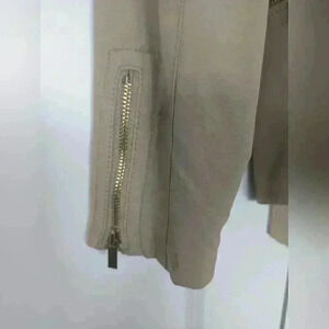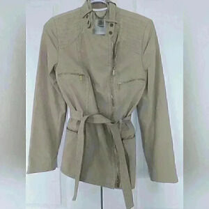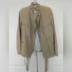 Women's size small Biker Jacket with Asymmetrical Zipper and partly sinched in the back to give it a fitted look. Jacket is lined, material is mix blend