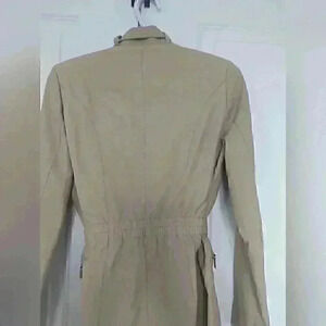Cotton/Nylon, Polyester/ Spandex. The details and zipper are a shiny gold which gives it a elegant look. Perfect color for the spring!