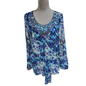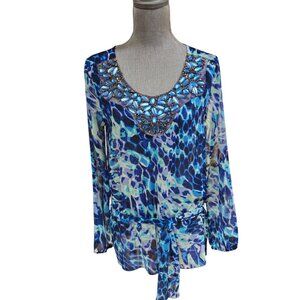 Cache Women's Blue Beaded Long Sleeve Sheer Blouse Small NWT