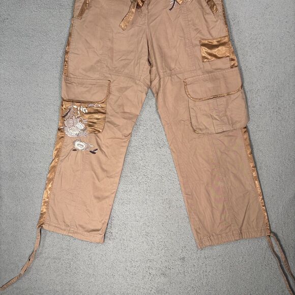 Cache Women’s Cropped Cargo Pants Size S Tan Brown Floral Boho Y2K Rave Fairy